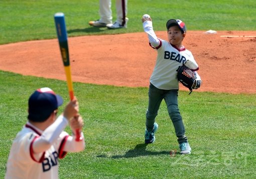 5일 오후 서울 잠실야구장에서 '2013 한국야쿠르트 세븐 프로야구' 두산 베어스와 LG 트윈스의 경기가 열렸다. 어린이날을 맞이해 시구자로 나선 김민국과 시타자로 나선 김성주가 시구-시타를 펼치고 있다.