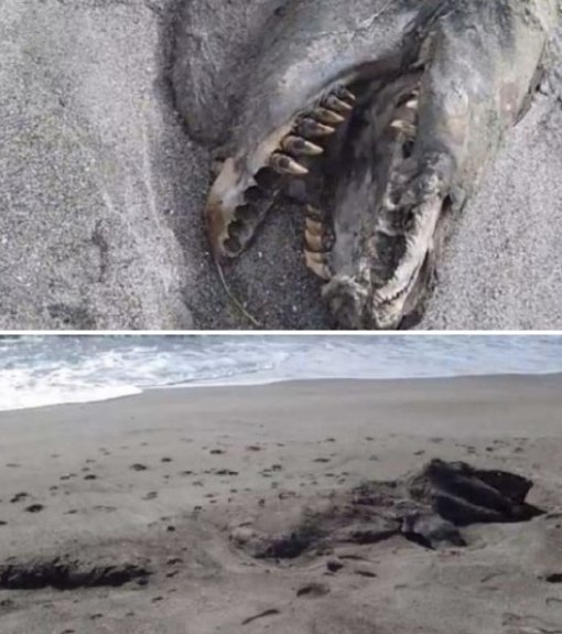 이 영상에는 정체를 알 수 없는 괴생물 사체의 모습이 담겨 있다. 게시자에 따르면 ‘선사시대 바다 괴물’이라 불리는 이 괴생물 사체는 몸길이가 9m에 달하며 날카로운 이빨과 거대한 몸집이 특징이다.