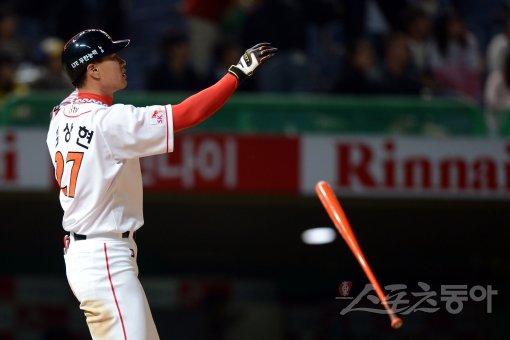 7일 오후 인천 문학야구장에서 '2013 한국야쿠르트 세븐 프로야구' SK 와이번스와 두산 베어스의 경기가 열렸다. 8회말 무사 1루에서 SK 김상현이 두산 정재훈을 상대로 좌월 투런홈런을 쏘아올리고 있다.