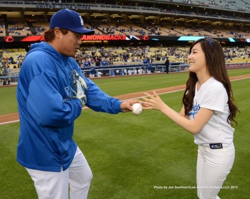 ‘코리안 몬스터’와 아시아 최고의 걸그룹이 만났다. 소녀시대의 멤버 티파니(오른쪽)가 7일(한국시간) 류현진의 소속팀 LA 다저스의 홈구장 다저스타디움에 나타났다. 티파니는 이날 애리조나와의 경기에 앞서 시구를 했고, 류현진은 직접 홈플레이트에 앉아 포수 역할을 했다. ‘야구 한류’와 ‘가요 한류’의 뜻 깊은 만남. 시구 후 류현진이 티파니에게 기념구를 건네며 반갑게 인사를 나누고 있다. 사진 제공|SM엔터테인먼트
