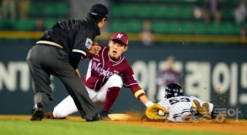LG 이대형의 빠른 발은 녹슬지 않았다. 이대형(오른쪽)이 7일 잠실 넥센전 6회말 2사 3루서 유격수 앞 내야안타로 타점을 올린 뒤 내친 김에 2루 도루까지 성공시키고 있다. 넥센 2루수 서건창(가운데)이 태그를 시도했지만 이미 늦었다. 스포츠동아DB