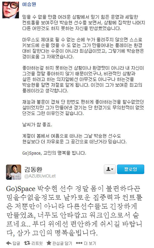 이어 "그가 만들어내는 플레이는 환경 대비 잘한다는 수준이 아니라 최상급이었고, 그렇기에 박승현은 경이로움 그 자체였다"라며 "비관적인 상황과 삶은 하려고 하는 의지 앞에선 아무것도 아니구나 하는 것을 박승현을 알면 저절로 알게 됩니다. 이것이 그가 보여준 최고의 플레이라고 생각한다“라고 박승현의 삶을 되새겼다.