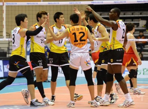 드림식스를 인수한 우리카드가 7월 KOVO컵에 러시앤캐시 이름으로 출전하는 희한한 상황이 벌어질 수도 있다. KOVO가 이 문제를 어떻게 해결할지 관심이다. 2012∼2013시즌 러시앤캐시 선수들이 환호하는 모습. 스포츠동아DB