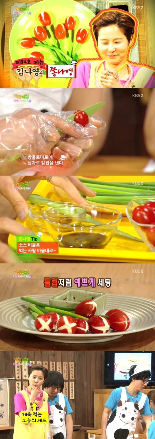 김나영은 9일 방송된 KBS 2TV ‘해피투게더 시즌3’의 야간 매점 코너에서 “자주 가는 이자카야 사장님이 알려주신 메뉴”라며 방울 토마토와 크림치즈, 마늘종이 들어간 일명 ‘쫑나영’을 자신 있게 소개했다.