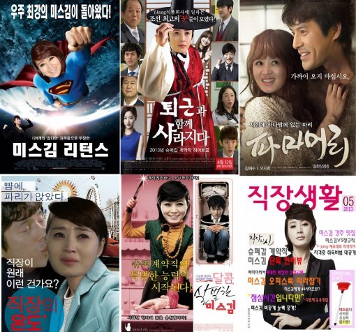 영화 ‘남자사용설명서’ 포스터를 패러디한 ‘미스김사용설명서’, ‘수퍼맨 리턴즈’를 패러디한 ‘미스김 리턴스’, ‘범죄의와 전쟁’ 패러디 ‘계약직과의 전쟁’ 등 유머가 돋보이는 작품들이 눈에 띈다.