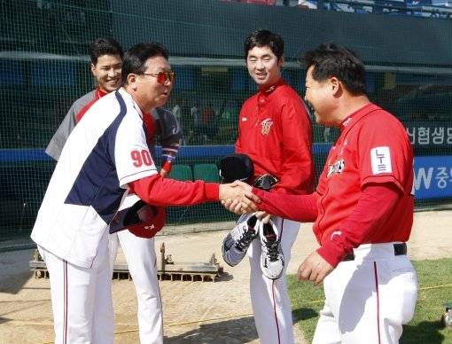 KIA 선동열 감독(90번)이 14일 광주 SK전에 앞서 이만수 감독(오른쪽 끝)과 만나 악수하고 있다. 2대2 트레이드로