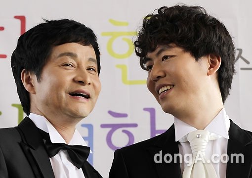 김조광수 감독(왼쪽)과 김승환 씨가 15일 오후 서울 동작구 사당동 예술영화관 아트나인에서 결혼식 발표하는 기자회견을 갖고 밝은 표정을 짓고 있다. 김승환 씨는 김 감독과 19살 연하의 동성 애인으로 레인보우팩토리 대표이다.