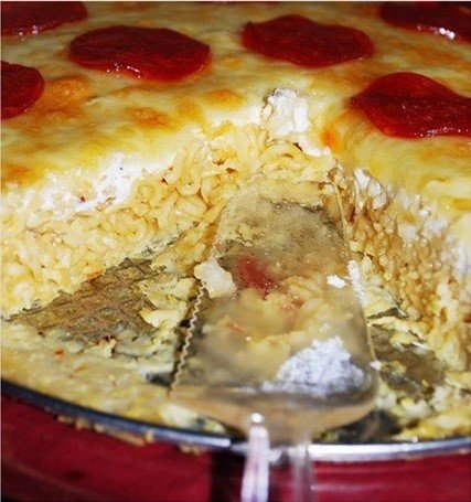 사진 속 피자는 두꺼운 치즈 아래 도우가 꼬불꼬불한 라면으로 이루어져 있어 보는 이의 궁금증을 유발시킨다.