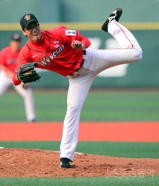‘대한민국 좌완 에이스’였던 SK 김광현이 서서히 위력적인 모습을 되찾아가고 있다. 안경을 쓴 김광현이 12일 목동 넥센전에서 힘차게 투구한 뒤 포수 미트를 바라보고 있다. 목동|박화용 기자 inphoto@donga.com 트위터 @seven7sola