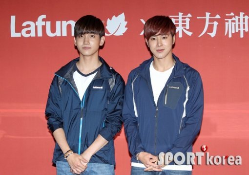 동방신기 최강창민, 유노윤호(오른쪽)가 16일 오후 서울 청담동 비하이브에서 열린 LG패션의 아웃도어 브랜드 ‘라푸마(Lafuma)’ 팬사인회에 참석해 포즈를 취하고 있다.