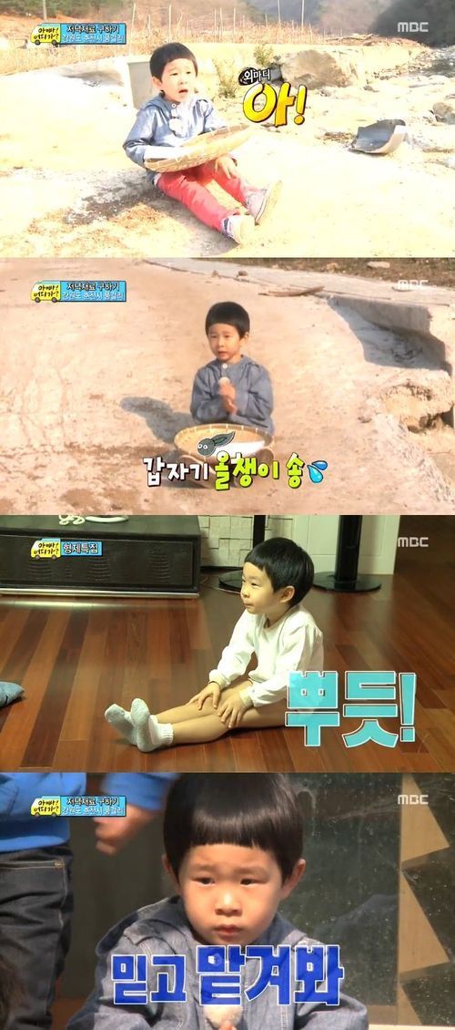 또 민율이는 형들이 개울가의 올챙이에 정신이 팔린 사이 “빨리 가야 한다. (지도를 가리키며) 여기가야한다”며 의젓하게 안내하기도 했다. 그러던 중 민율은 내리막 길에서 넘어졌고 자신을 알아봐 주는 사람이 없자 울지도 않고 대뜸 ‘올챙이 송’을 박수치며 불러 폭소케 했다.
