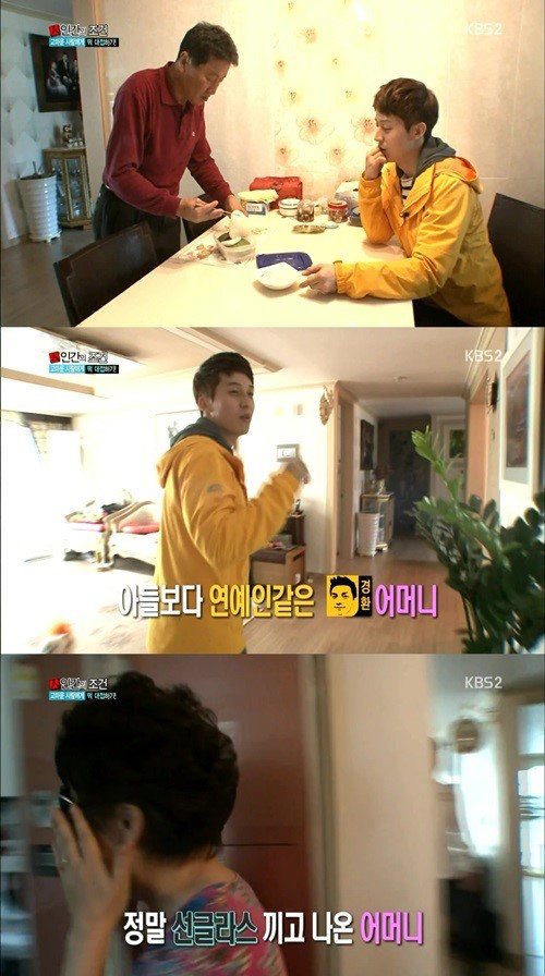 지난 18일 방송된 KBS2 ‘인간의 조건’에서 허경환은 ‘고마운 사람에게 떡 선물하기’ 미션을 받고 감사의 마음을 전하기 위해 부모님이 계신 통영을 찾았다.