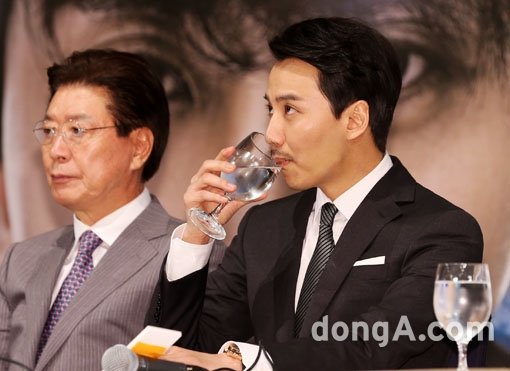 배우 김남길이 21일 오후 서울 강남구 컨벤션디아망에서 열린 KBS 2TV 드라마 ‘상어’ 제작발표회에서 취재진의 질문을 들으며 물을 마시고 있다.