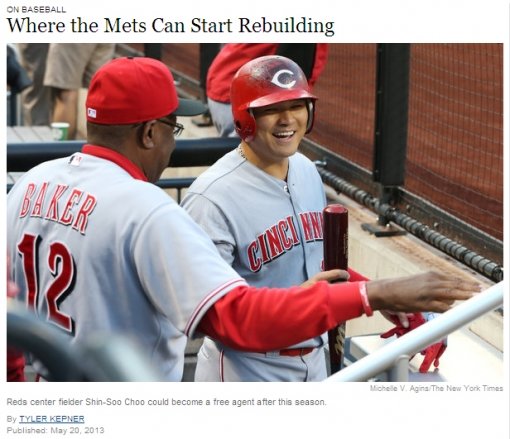 미국의 유력 언론 뉴욕타임즈(NYT)는 21일(한국시간) ‘뉴욕 메츠가 올 시즌 종료 후 FA(프리에인전트) 자격을 얻는 추신수(31·신시내티)의 영입을 고려해야 한다’는 내용의 기사를 실었다. 가장 주목한 부분은 추신수의 출루율이다. 지난 시즌 1번타자의 출루율이 0.254에 불과했던 신시내티를 추신수가 변화시켰다는 것이다. 추신수는 22일까지 팀 동료 조이 보토(0.477)에 이어 내셔널리그 출루율 부문 2위(0.455)에 올라있다.