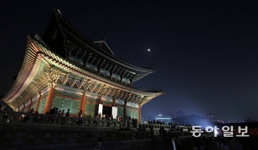 경복궁 야간 개장 첫날인 지난 22일 저녁 많은 시민이 궁궐의 밤 풍경을 만나기 위해 경복궁을 찾았다. 은은한 달빛 아래 근정전이 아름다운 자태를 뽐내고 있다. 경복궁 야간 개장은 26일까지 진행되며 관람 시간은 오후 6시 반부터 10시까지. 관람료는 3000원이다.