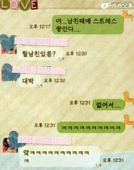 공개된 사진은 두 친구의 카카오톡 대화를 캡처한 것. 한 친구는 다른 친구에게 “아, 남친 때문에 스트레스 쌓인다”라고 말했다. 이에 다른 친구는 “남친있어? 대박”이라고 놀란다.