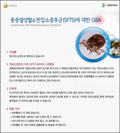 지난 22일 질병관리본부는 ‘중증열성혈소판감소증후군(SFTS)에 대한 Q&A’ 글을 통해 “살인진드기의 치사율이 6% 정도로 확인되고 있다”고 밝혔다.