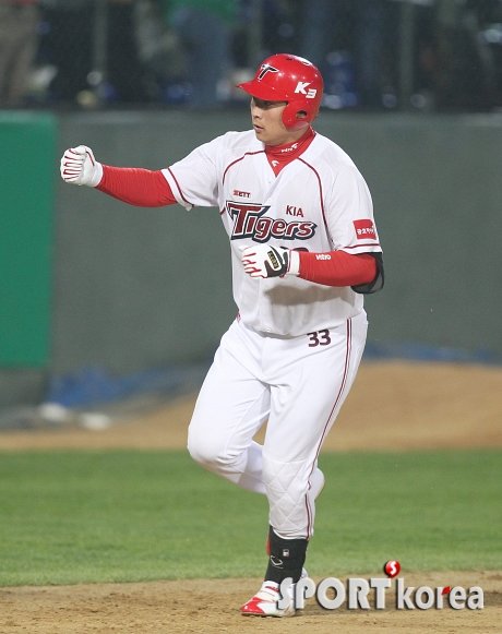 ‘2013 한국 야쿠르트 세븐 프로야구’ KIA 타이거즈와 한화 이글스의 경기가 23일 오후 광주 무등야구장에서 열렸다. 4회말 1사 1루에서 KIA 김주형이 한화 안승민을 상대로 좌월 투런홈런을 친 후 그라운드를 돌며 환호하고 있다.