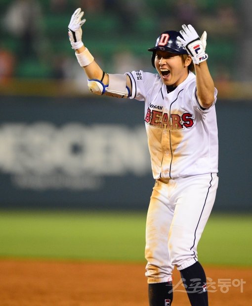 23일 저녁 서울 잠실야구장에서 열린 프로야구 두산과 넥센의 경기에서 연장 11회말 1사 만루 두산 타자 정수빈이 끝내기 안타를 치고 나가며 세리머니를 펼치고 있다. 잠실|박화용 기자 inphoto@donga.com 트위터 @seven7sola