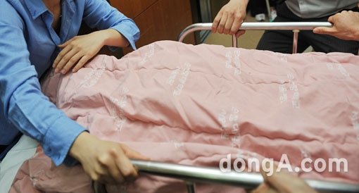자살을 기도한 가수 손호영이 24일 오전 서울 용산구 순천향대병원 응급실에서 중환자실로 이송되고 있다. 병원 관계자들은 손호영의 전신을 이불로 가리고 재빨리 중환자실로 옮겼다. 현재 손호영은 의식은 있으나 심리적으로 불안정한 상태다.