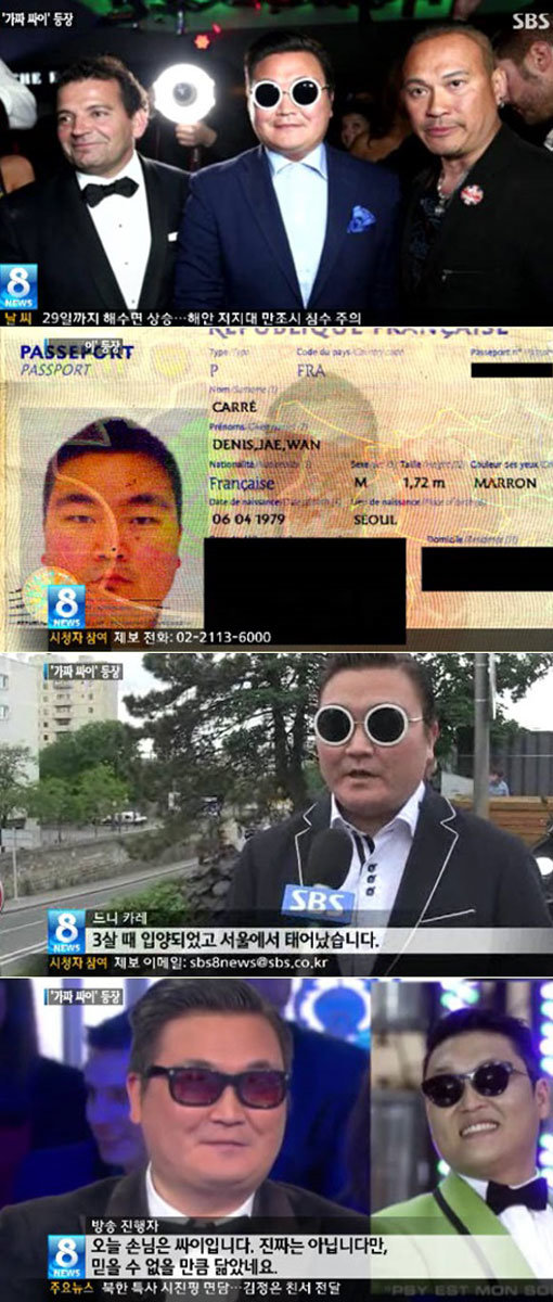 24일 SBS '8시 뉴스'는 '가짜 싸이'와 프랑스 현지에서 인터뷰를 진행했다. 그는 드니 카레라는 이름의 한국인 입양아 출신 프랑스인이다.