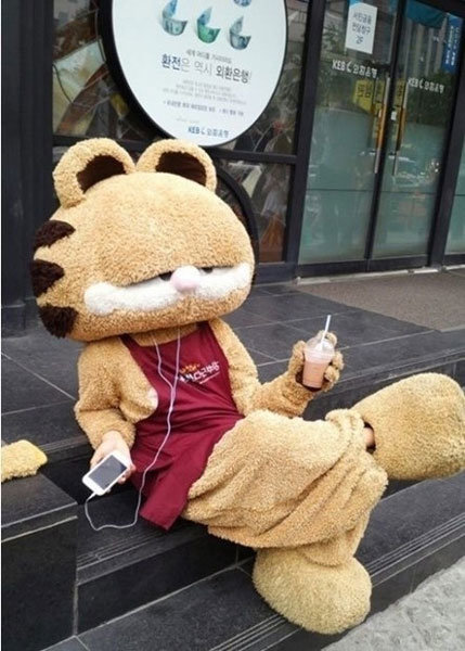 사진 속 고양이 인형을 입은 알바생은 길가 계단에 앉아 있다. 한 손에는 음료를 들고 음악을 들으며 여유를 즐기는 모습으로 눈길을 끌었다.