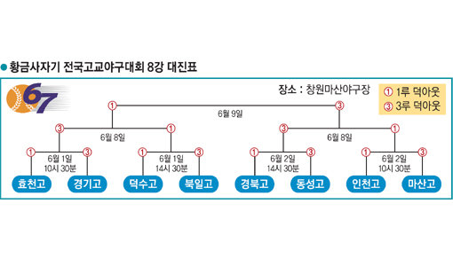 마산고와 인천고가 26일 창원 마산구장에서 열린 제67회 황금사자기 전국고교야구대회 겸 주말리그 왕중왕전(동아일보·스포츠동아·대한야구협회·창원시 공동 주최) 16강전에서 각각 부산공고와 군산상고를 꺾고 8강전에서 맞붙게 됐다.(그래픽 참고)