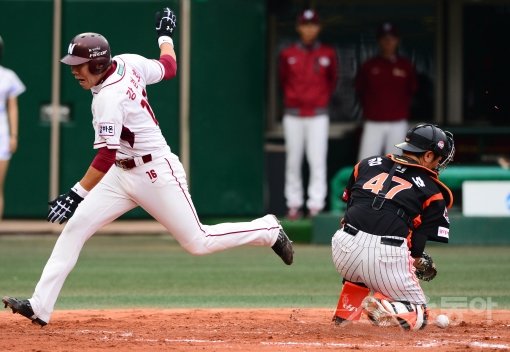 목동 롯데-넥센전 1회말 2사 1·2루. 넥센 2루주자 강정호(왼쪽)가 오윤의 안타 때 홈까지 뛰어 들었지만, 롯데 포수 강민호의 발에 막혀 홈플레이트를 밟지 못했다. 목동|박화용 기자 inphoto@donga.com 트위터 @seven7sola