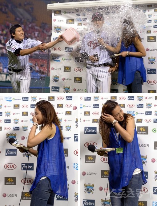 앞서 정인영 아나운서는 전날 잠실야구장에서 열린 2013 프로야구 LG 트윈스와 SK 와이번스의 경기 직후 9회말 끝내기 안타를 친 LG 정의윤을 인터뷰하다 몰래 난입한 임찬규에게 물벼락을 맞았다.
