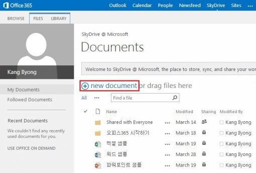 오피스365 홈페이지에 접속하고 스카이드라이브를 선택하면, 지금까지 오피스365로 작성한 문서를 한눈에 확인할 수 있다.