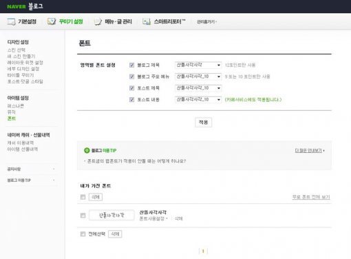 스킨의 경우 다른 블로거가 만들어 놓은 스킨을 적용할 수도 있고, 자신이 직접 스킨을 만들어 사용할 수도 있다. 편의에 따라 레이아웃을 정하고 사진을 편집하면 된다. 폰트도 아이템 팩토리에서 자신의 개성에 맞는 것으로 골라 담아 설정에 따라 적용하면 된다.