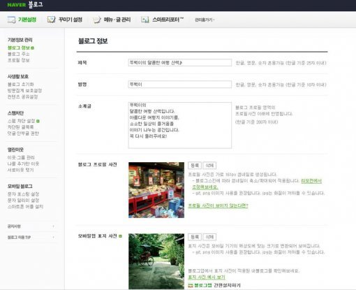 네이버 회원가입 절차를 거치면 자동으로 블로그가 개설된다. 빈 블로그에 하나씩 아기자기한 요소를 채워 넣어가면 된다. 먼저 블로그의 자기소개 탭에 마련된 관리/통계 버튼을 눌러 관리 화면을 띄운다. 관리는 '기본설정'과 '꾸미기 설정', '메뉴/글 관리', '스마트리포터' 등의 탭으로 분류돼 있다. 여기서 기본 설정을 눌러 블로그 제목과 별명, 소개 글 등을 입력한다. 블로그 메인 화면에 노출할 프로필 사진도 설정해야 한다.