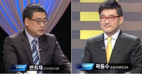 MBC ‘100분 토론-일베 표현의 자유 어디까지’에 출연한 변희재 미디어워치 대표와 곽동수 숭실사이버대 교수.