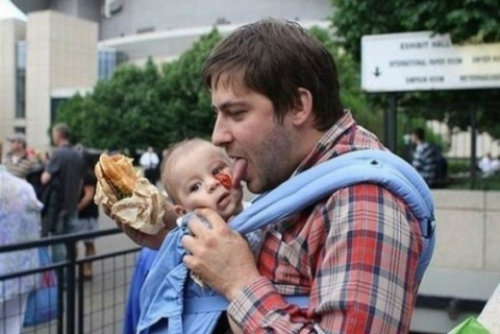 '와이프 안 볼 때 애 보기' 사진에는 한 남성이 아이를 매고 게임을 하고 있는 모습이 담겼다. 남성은 귀찮은듯 아이가 몸을 비틀어도 게임에만 몰두해 눈길을 끌었다.