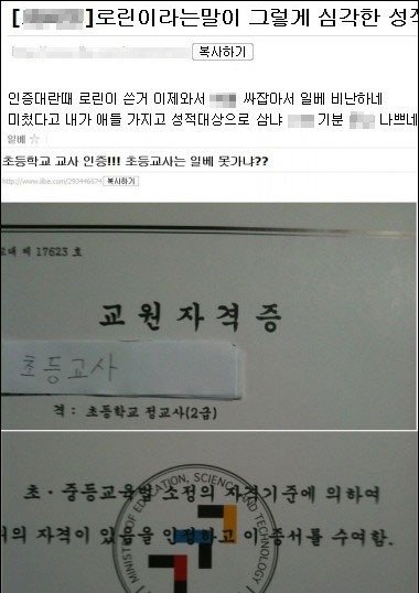 지난해 10월 한 초등학교 교사가 일베에 인증글을 남겼다. 이 교사는 자신의 신분을 인증하기 위해 정교사 자격증 사진과 초등학생 얼굴을 모자이크한 사진을 함께 공개했다. 사진들 밑에는 “로린이들 개귀엽다능”이라는 설명을 달았다.