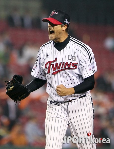 ‘2013 한국 야쿠르트 세븐 프로야구’ LG 트윈스와 한화 이글스의 경기가 29일 오후 서울 잠실야구장에서 열렸다. LG 선발 주키치가 4회초 2사 1, 2루에서 한화 최진행을 삼진으로 처리 한 후 환호하고 있다.