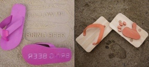 첫 번째 사진 속 분홍 슬리퍼의 밑창에는 각각 ‘Follow Me’(나를 따라와), ‘Bring Beer’(맥주를 가져와) 라고 적혀 있어 걸음을 옮길 때 마다 모래에 글이 새겨진다.