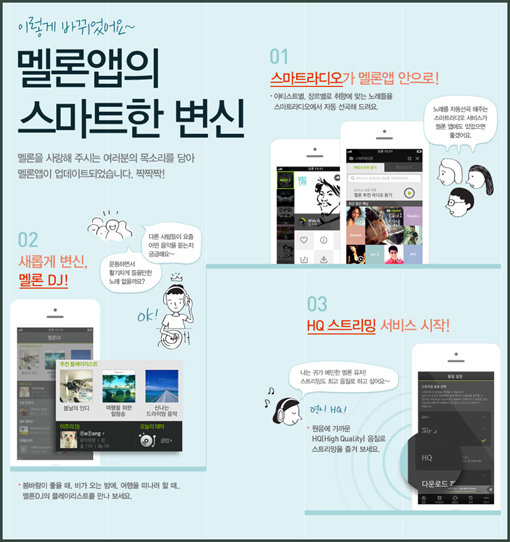 이어 “‘스마트라디오’는 이용자 취향의 곡을 간단한 버튼 선택만으로 추천 받고 무제한으로 감상할 수 있는 장점이 있어 이미 웹에서 많은 사용자들이 애용하는 서비스”라며 “이와 함께 일상에서 상황별 어울리는 곡을 ‘멜론 DJ’를 통해 자유롭게 선곡 받을 수 있다. 선곡된 플레이리스트에 대해서는 ‘좋아요’, ‘나도 한마디’ 등 공감을 표현하거나 선곡자와 친구 맺기 등을 통해 감상영역을 넓히고 음악을 통해 이용자 간 교감이 가능하다”고 전했다.