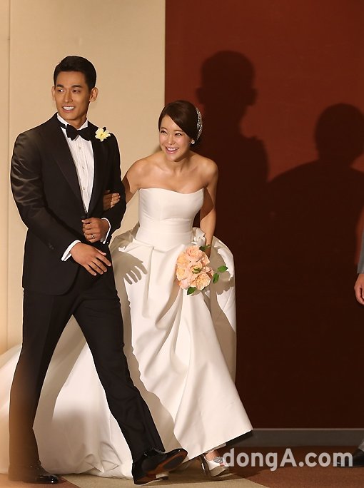 백지영과 정석원이 웨딩마치를 울린다. 가수 백지영과 배우 정석원이 2일 오후 서울 광진구 쉐라톤워커힐호텔에서 올린 결혼식에 올리기 전에 기자회견을 갖기 위해 회견장으로 입장하고 있다.