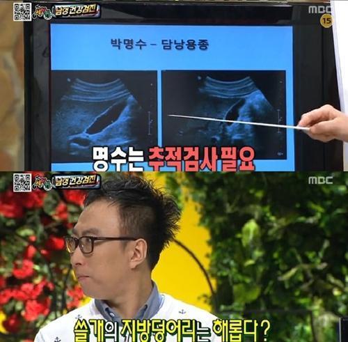 박명수 담낭용종 발견에 담당 의사는 “용종 때문에 추적검사가 필요하다. 쓸개에 기름이 꼈다는 건 다른 곳에 더 많이 꼈다는 증거다. 지방간과 동맥경화 등 의심된다”고 말하며 금주를 권했다.