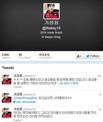 앞서 기성용은 2일 트위터에 “리더는 묵직해야 한다. 그리고 안아줄 수 있어야 한다. 모든 사람을 적으로 만드는 건 리더 자격이 없다”는 글을 올렸다. 기성용의 글에 네티즌들은 그가 말하는 리더가 누구인지에 대해 관심을 가지기 시작했고, 각종 추측이 난무했다.