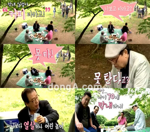 이에 나이 70에 커피 신부름이 달갑지 않은 백일섭은 “나보고 타라고? 못 타”라며 반항했다. 그러나 전혀 아랑곳하지 않은 형님들은 백일섭에게 강한 눈빛으로 다시 한번 그에게 커피를 타라고 메시지를 보냈다.