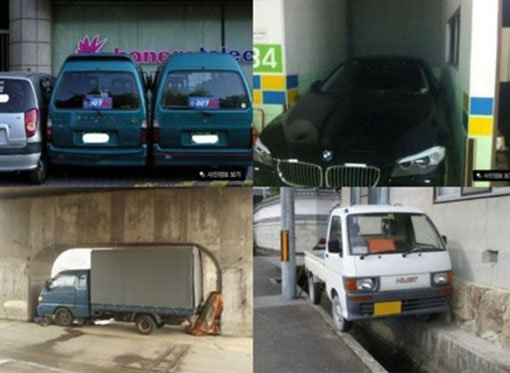 해당 사진엔 여러 대의 주차된 자동차가 보인다. 각각의 자동차는 조금의 틈도 없는 좁은 공간이나 바닥이 깊은 도랑 위에 아슬아슬하게 주차돼 있어 눈길을 끈다. 도무지 사람의 솜씨라고는 믿을 수 없는 광경에 ‘유령이 한 주차’라는 제목이 붙게 된 것이다.