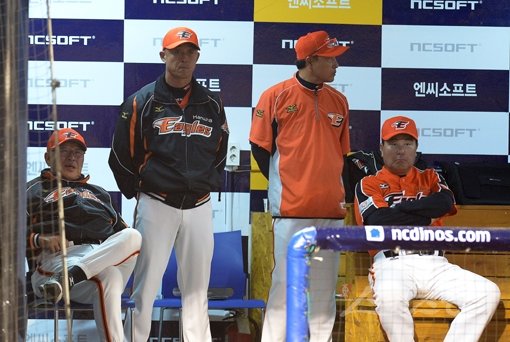 3일부터 4일 휴식기에 돌입한 한화가 팀 정비와 실전감각 유치를 위해 4일 2군과 연습경기를 치른다. 사진은 지난달 9일 마산구장에서 펼쳐진 NC전 도중 경기가 잘 풀리지 않는 듯, 얼굴을 찡그리고 있는 한화 김응룡 감독(왼쪽 끝)과 코칭스태프. 스포츠동아DB