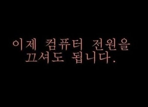 사진 속에는 검은색 바탕에 ‘이제 컴퓨터 전원을 끄셔도 됩니다’라는 문구가 적혀 있다. 이는 퍼스널 컴퓨터 운영체제인 ‘윈도우’ 구 버전에서 컴퓨터를 종료할 때 나타나던 화면.