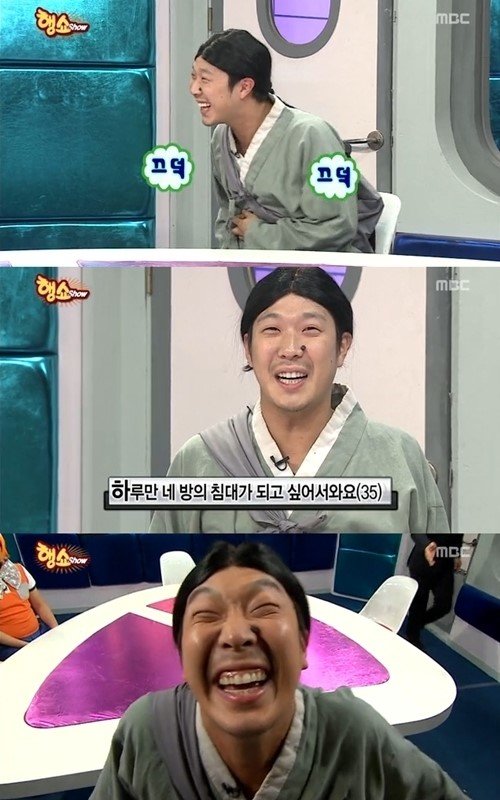 하하는 8일 방송된 MBC ‘무한도전’의 ‘행쇼’에서 순수총각으로 변신했다. 하하는 자신의 이름을 "하루만 네 방에 침대가 되고 싶어요"라고 소개하며 아무것도 모르는 행세를 했다.