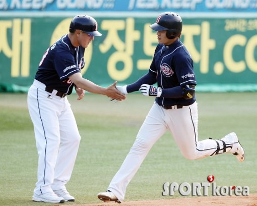 9일 오후 대구 시민야구장에서 열린 `2013 한국 야쿠르트 세븐 프로야구` 삼성 라이온즈와 두산 베어스의 경기 4회초 무사 상황에서 두산 민병헌이 동점 솔로포를 터뜨리고 그라운드를 돌고 있다.