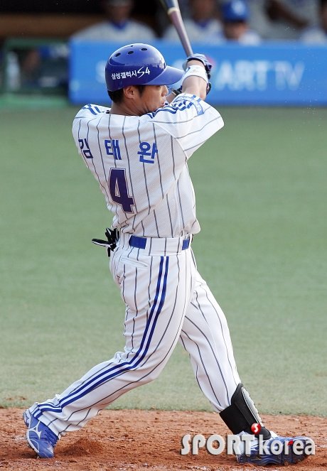 9일 오후 대구 시민야구장에서 열린 `2013 한국 야쿠르트 세븐 프로야구` 삼성 라이온즈와 두산 베어스의 경기 4회말 2사 1, 2루 상황에서 삼성 김태완이 적시타를 때려내고 있다.