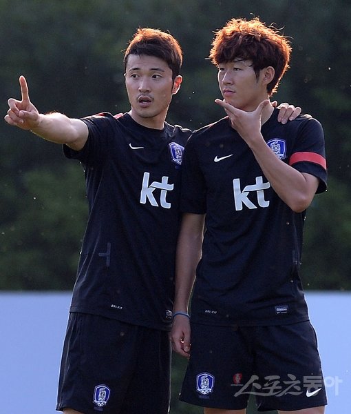 FIFA로부터 받은 2경기 출전정지 징계에서 벗어나 11일 우즈베키스탄전에 선발 출전할 것으로 보이는 박종우(왼쪽)가 9일 훈련에서 손흥민과 전술을 의논하고 있다. 파주|김종원 기자 won@donga.com 트위터 @beanjjun