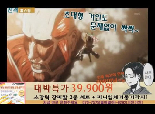 영상은 “거인이 쳐들어올까봐 걱정 되신다고요?”라고 시작해 “탁월한 절삭력으로 인류를 위협하는 거인도 싹싹”, “질긴 근육도 싹싹” 등의 많이 들어본 홍보가 이어진다.